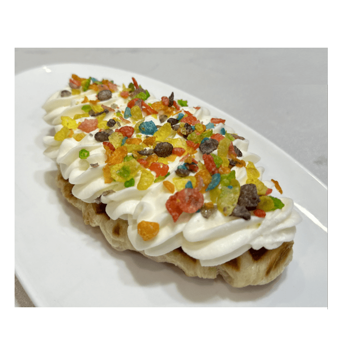 A cheerful twist on the croffle — crispy croissant waffle layered with whipped yogurt cream and finished with a generous sprinkle of Fruity Pebbles. Sweet, crunchy, and irresistibly nostalgic.