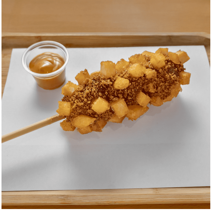 Covered in a golden layer of crispy potato cubes, this Korean Hot Dog delivers an irresistible texture and hearty bite. Available with beef or mozzarella fillings, this is the go-to choice for anyone craving a rich, savory twist on the original.